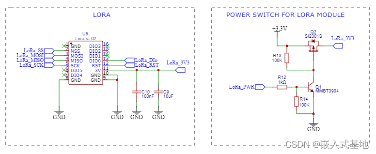 該設(shè)計中添加了一個電源開關(guān)電路,通過使用 MOSFET (Q2)和晶體管(Q1) ,在睡眠模式期間完全關(guān)閉了 LoRa 模塊。