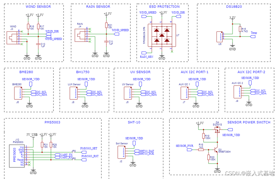 我通過使用MOSFET(Q3)和晶體管(Q4)添加了一個電源開關(guān)電路,以便在睡眠模式下完全關(guān)閉所有的傳感器(當沒有傳感器數(shù)據(jù)要發(fā)送時)。ESP32的GPIO引腳26被用來控制這個電源開關(guān)。