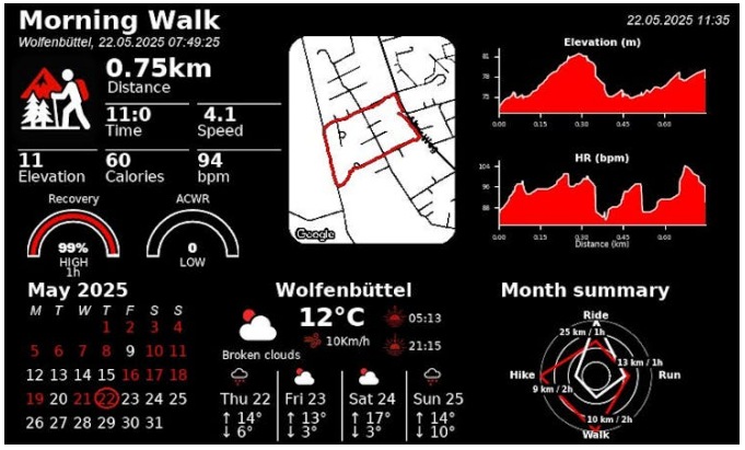 基于此,用戶可以隨心所欲地設(shè)計(jì)自定義小部件——從他們自己的數(shù)據(jù)源中提取數(shù)據(jù),或者使用Strava、Garmin和weather的內(nèi)置集成。該系統(tǒng)足夠靈活,可以支持文本、圖像、圖表或您希望在電子紙顯示中包含的任何視覺元素。
