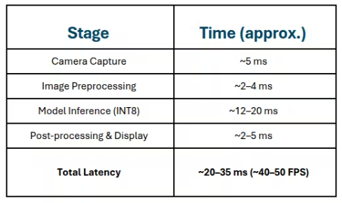 該模型使用NVIDIA的高性能深度學習推理庫TensorRT進行優(yōu)化。這使得Jetson Nano可以利用其板載GPU加速處理。創(chuàng)建了一個輕量級推理應用程序來處理相機輸入、圖像預處理、模型執(zhí)行和輸出可視化——所有這些都是實時的。