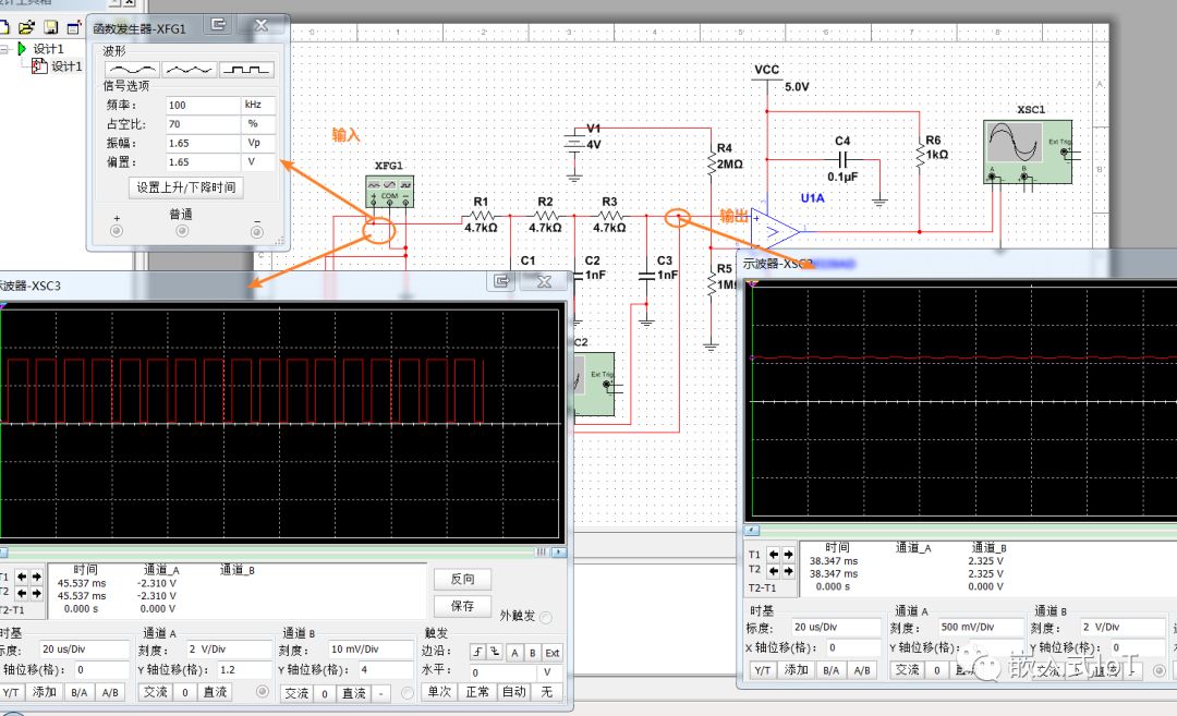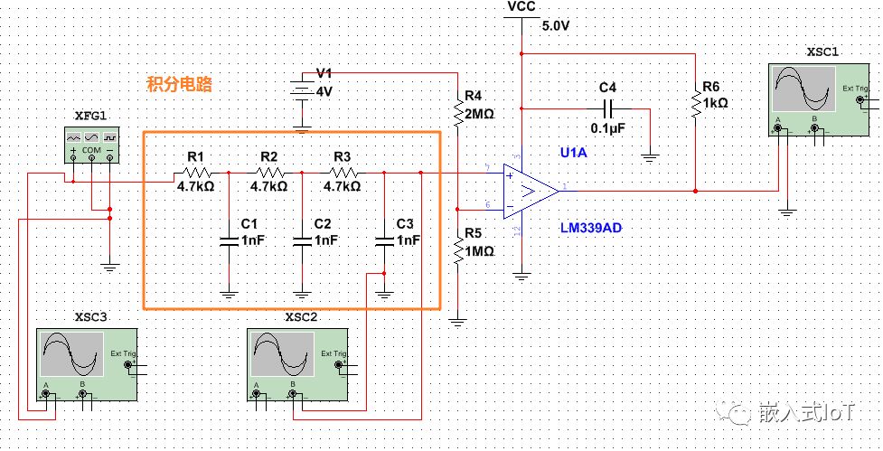 由于電容兩端的電壓不能突變,這里采用三階積分電路,使得輸出到比較器的電壓是一個平滑的直流電壓。