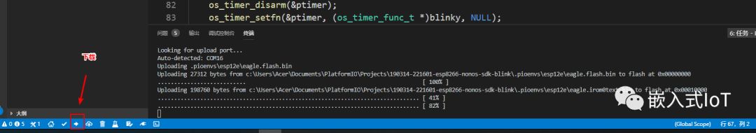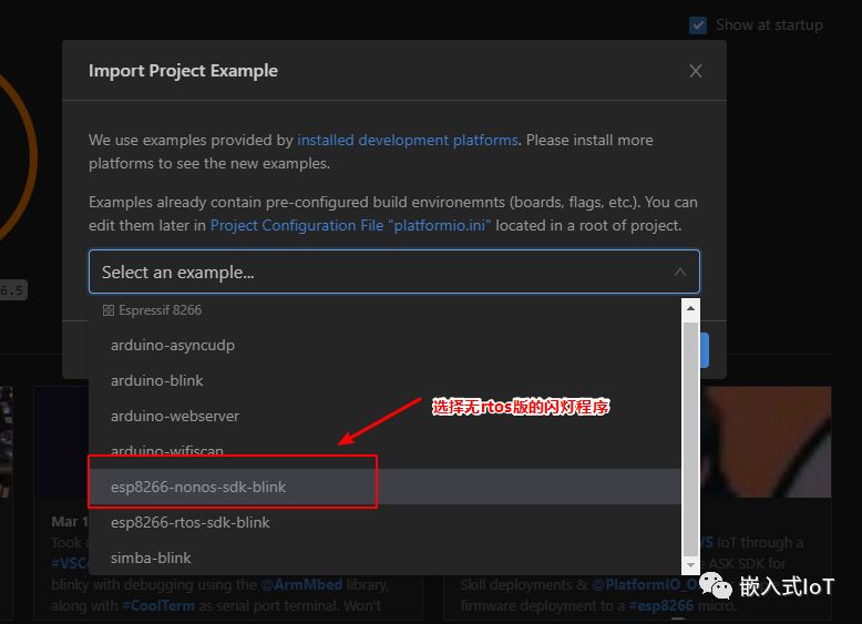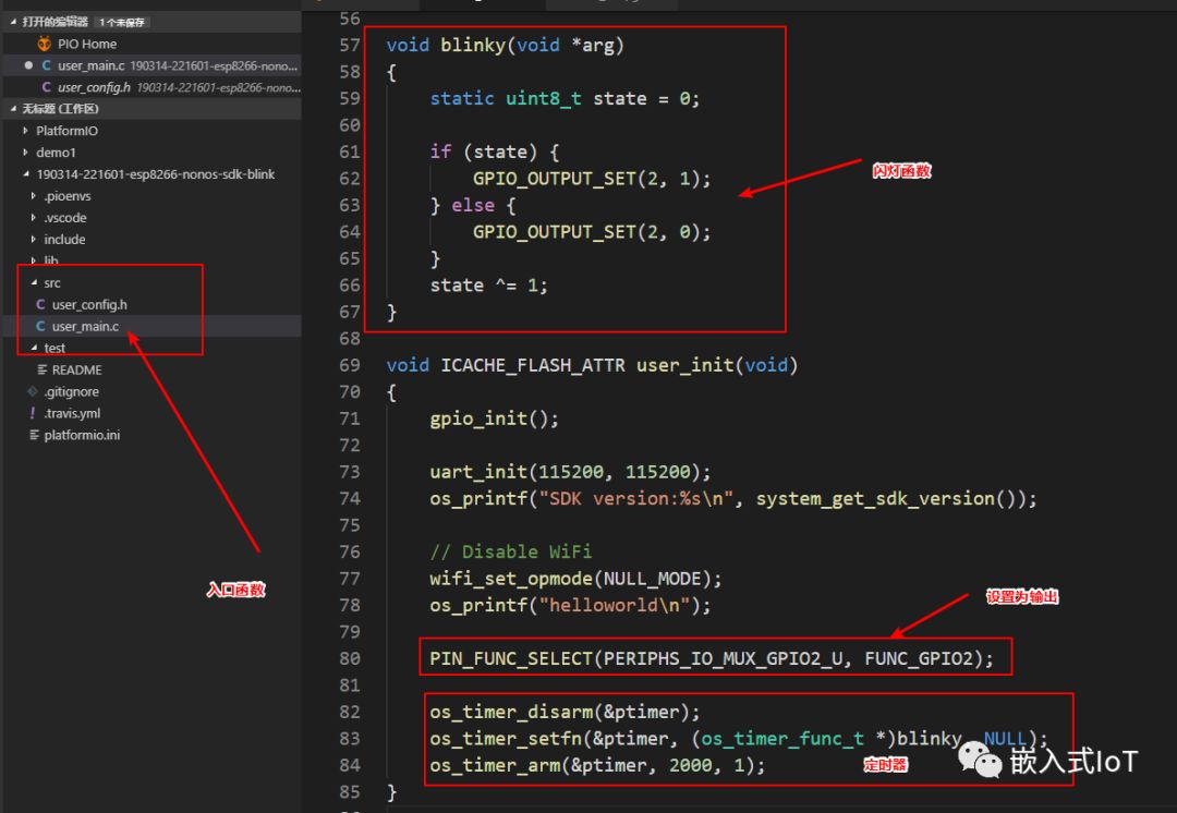點(diǎn)擊左側(cè)的螞蟻圖標(biāo)新建一個(gè)8266的工程。我們可先從一個(gè)閃燈和輸出helloworld程序開(kāi)始。