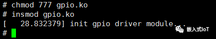 在開發(fā)板上,輸入insmod gpio.ko看到掛載完成表示成功。