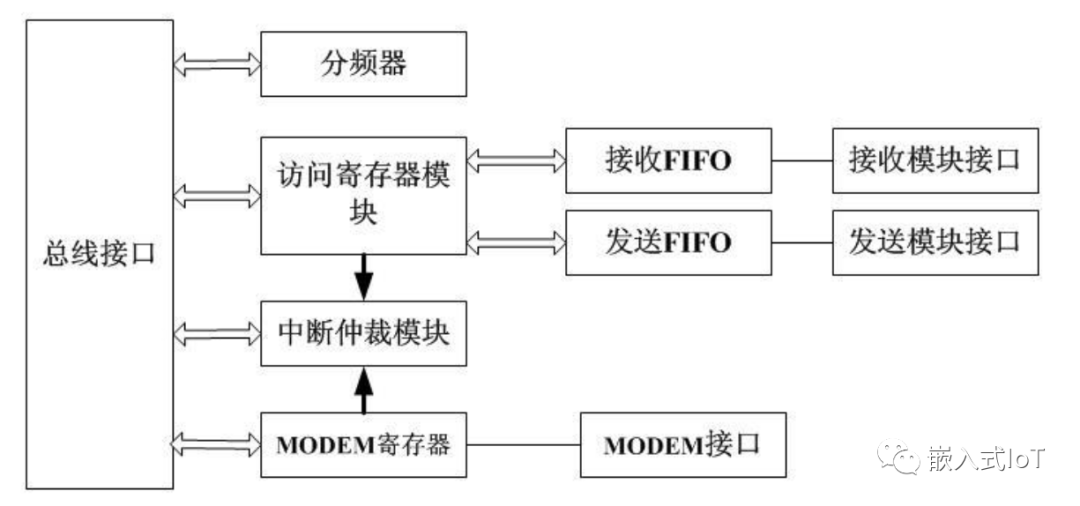 3.中斷仲裁模塊:當(dāng)任何一種中斷條件被滿(mǎn)足,并且在中斷使能寄存器(IER)中相應(yīng)位置 1,那么 UART 的中斷請(qǐng)求信號(hào) UAT_INT 被置為有效狀態(tài)。