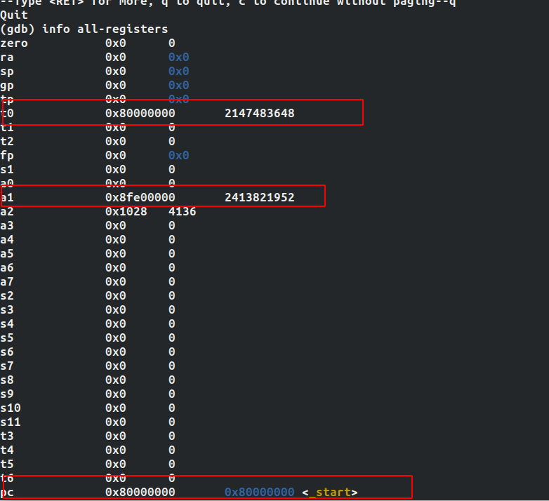輸入info all-registers可以看到riscv所有寄存器的值的狀態(tài),這里剛到入口處寄存器怎么會有初值呢?這里就是很關(guān)鍵的問題,后面再分析代碼的時候,會詳細(xì)分析這些問題。另外可以分析得出當(dāng)前的函數(shù)的入口0x80000000。