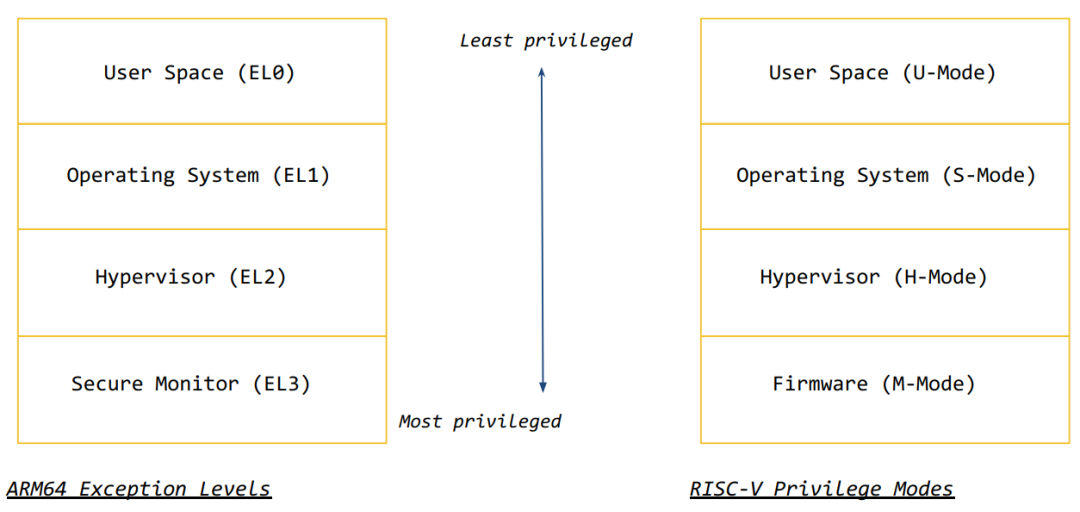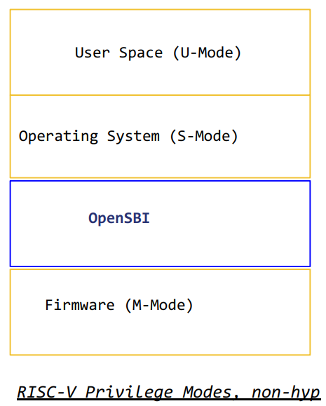 而對于risc-v來說,系統(tǒng)上電啟動后會在M-Mode,而risc-v目前是沒有Hypervisor這一層的概念的,所以目前采用的是opensbi。