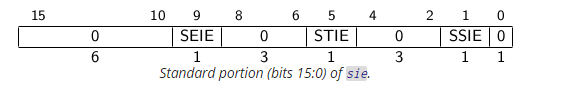 要開啟時鐘中斷,這樣才能產(chǎn)生時鐘,而根據(jù)手冊,開啟時鐘中斷實際上是設(shè)置Supervisor Interrupt Enable(sie),也就是設(shè)置SIE的寄存器開啟。