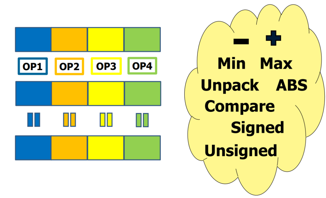 在上述的指令中,規(guī)定了add16的編碼規(guī)則,對于RV32來說,一個(gè)寄存器的位寬是16,那么可以將一個(gè)寄存器拆分成兩個(gè)單元,一個(gè)機(jī)器周期,同時(shí)執(zhí)行兩條加法。同樣的指令,在RV64上,則可以拆分成四個(gè)單元,一個(gè)機(jī)器周期,可以執(zhí)行四條加法。
