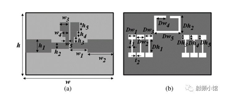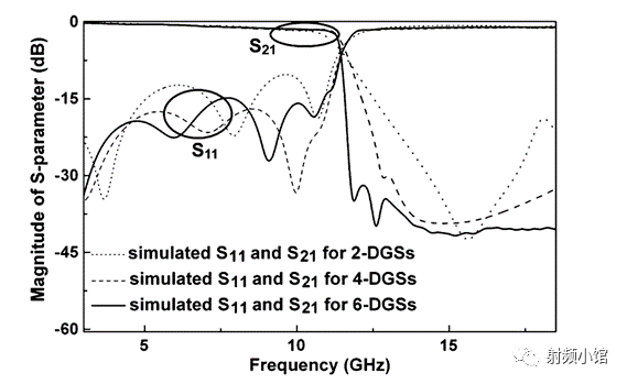 2010年,Kim Young-Sik 等人利用“啞鈴”型缺陷地結(jié)構(gòu)(DGS),在寬帶帶通濾波器的帶外引入多個(gè)傳輸零點(diǎn),然而帶外抑制的寬度嚴(yán)重依賴于DGS的個(gè)數(shù),且在這個(gè)設(shè)計(jì)中20-dB的抑制水平僅延伸到3f0(f0為帶通響應(yīng)的中心頻率左右。