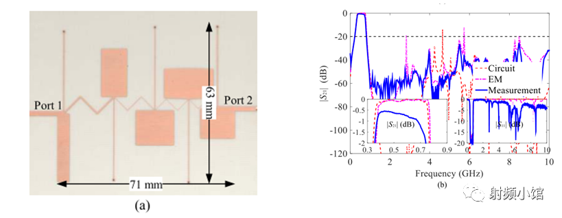 在2017年,WU KE LI等人提出了復(fù)合型串聯(lián)諧振單元,這個(gè)單元由高阻抗傳輸線并聯(lián)一個(gè)集總電容,并且將寬帶理論運(yùn)用到綜合所提出分布/集總混合電路,實(shí)現(xiàn)了7*f0的寬阻帶特性。