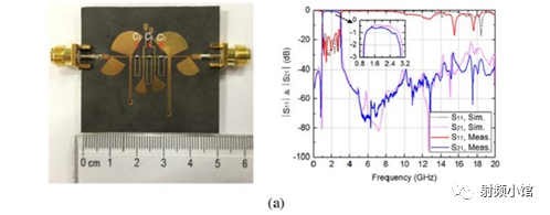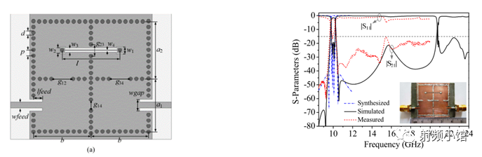 18年,W Shen給出了一種綜合利用半?;刹▽?dǎo)(Half mode substrate integrated waveguide, HMSIW)諧振腔、共面波導(dǎo)(Co-planar waveguide, CPW)、微帶線設(shè)計(jì)的寬阻帶濾波器,由于三種不同的傳輸線具有不同的諧振特性,使得所提出的濾波器結(jié)構(gòu)具有了2.65倍中心頻率的阻帶抑制性能。但這種設(shè)計(jì)無疑需要對(duì)諧振腔形狀和諧波頻率做出精巧合理的規(guī)劃才能實(shí)現(xiàn),而這將提高濾波器設(shè)計(jì)的復(fù)雜度。