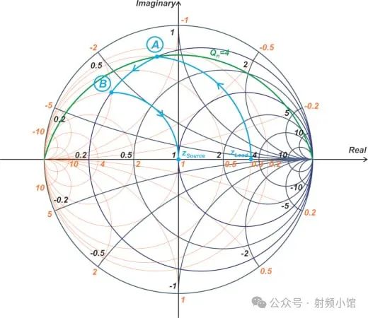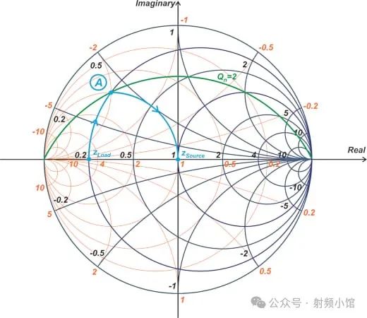 由于只允許從zLoad到zSource進行兩次運動,中間阻抗必須在r = 0.2和g = 1圓的交點處(圖中的點A)。這意味著,在兩元件網(wǎng)絡(luò)中,我們無法調(diào)整中間阻抗的位置,因此電路的品質(zhì)因數(shù)是固定的。正如我們所見,交點位于我們示例中的Qn = 2圓上。你可能想知道如果我們沿著r = 0.2圓繼續(xù)運動到點A上方的某個點會發(fā)生什么。這在圖3中顯示。