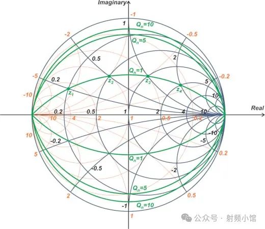 根據(jù)方程1,z1、z2、z3和z4的復(fù)共軛也會產(chǎn)生Qn = 1。這些點還對應(yīng)于史密斯圖的下半部分另一條Qn = 1曲線。此外,上述圖示還顯示了Qn = 5和10的等Q圓??梢宰C明,具有Qn = a的阻抗在Γ-平面上會轉(zhuǎn)化為兩個圓。這兩個圓的半徑均為1+1?21+a21,一個以(0, -1/a)為中心,另一個以(0, 1/a)為中心。