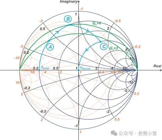 在上圖中,我們選擇了點C處的中間阻抗,其Qn小于2。由于我們的目標是使用T型網(wǎng)絡(luò),我們應(yīng)該沿著通過點C的恒導(dǎo)納圓繼續(xù)我們的運動(在我們的例子中是g = 1.2的圓)。為了得到一個三元件網(wǎng)絡(luò),g = 1.2的圓必須與通過zSource的r = 1的圓相交。然而,上圖顯示,如果中間點C的Qn小于2,那么通過C的等導(dǎo)納圓不會與r = 1的圓相交。因此,不可能使T型網(wǎng)絡(luò)的Qn小于L型網(wǎng)絡(luò)。
