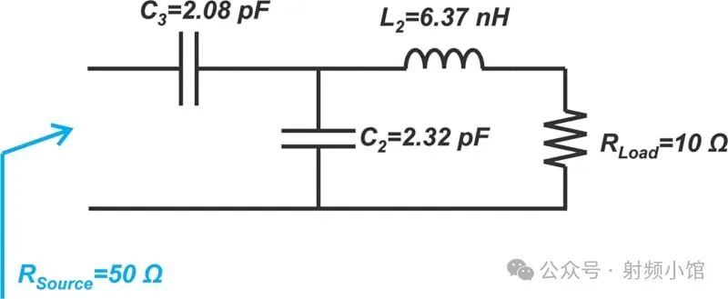 在圖2中,從點A到zSource的運動需要一個具有電納bSource - bA = 0j - (-j2) = j2的并聯(lián)電容。這可以通過一個6.37 pF的并聯(lián)電容實現(xiàn)。最終的L型網(wǎng)絡(luò)如圖5所示。