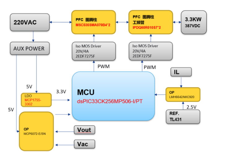 圖示3-大聯(lián)大品佳基于Microchip產(chǎn)品的3.3KW雙向圖騰柱PFC逆變電源方案的方塊圖