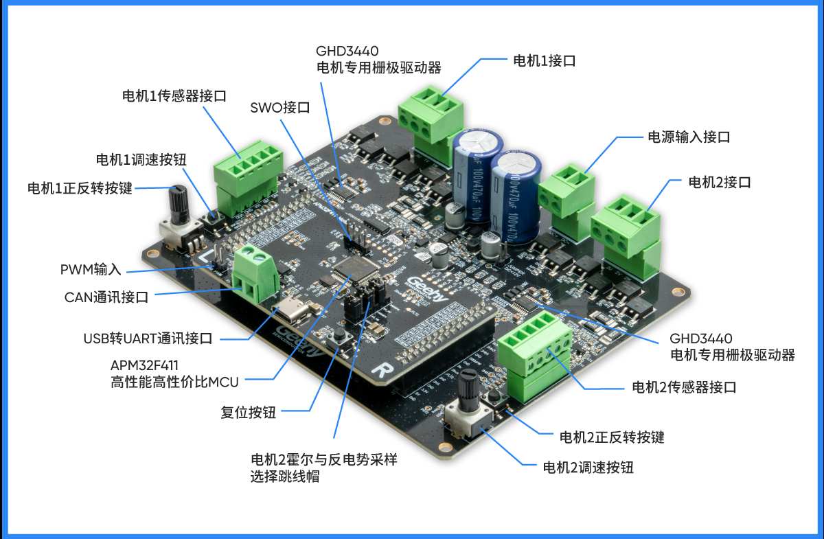 - 高算力控制: APM32F411主控芯片搭載Cortex-M4F內(nèi)核,主頻高達(dá)120MHz,可在單核內(nèi)實(shí)現(xiàn)兩路速度環(huán)、電流環(huán)雙環(huán)運(yùn)算,實(shí)現(xiàn)雙路獨(dú)立PMSM或BLDC控制;