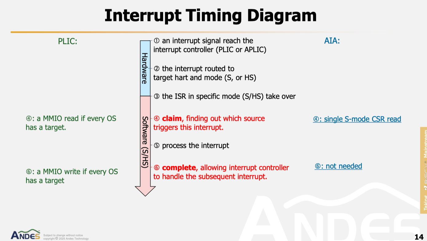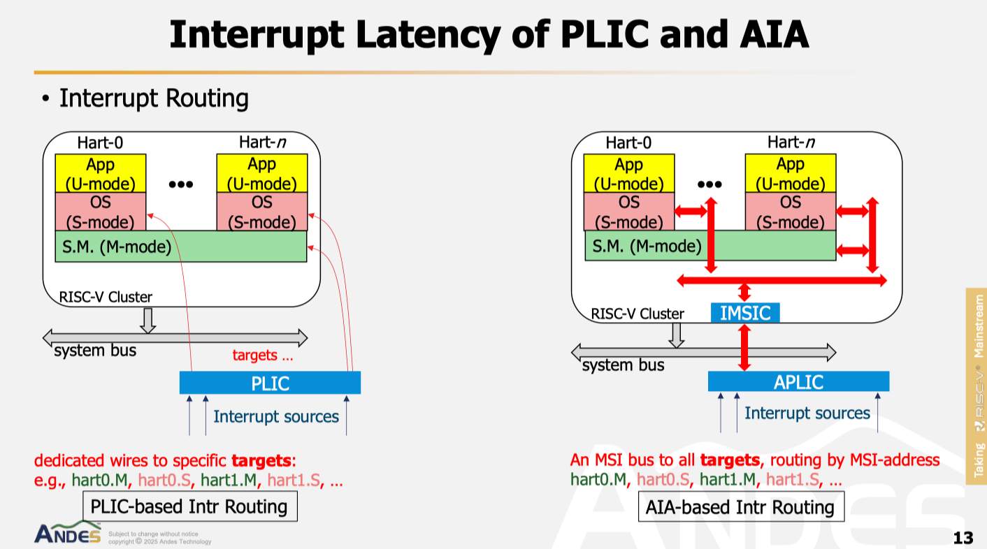 在軟件處理階段,晶心科技對(duì)比了基于PLIC(Platform-Level Interrupt Controller)和AIA兩種中斷處理方案的差異。在基于PLIC的平臺(tái)中,操作系統(tǒng)需要直接讀取內(nèi)存映射I/O(MMIO)上的寄存器來完成中斷聲明(claim)動(dòng)作,這要求配置PMP(Physical Memory Protection)資源以保護(hù)系統(tǒng)。如果配置不足,聲明動(dòng)作需通過虛擬化層完成,進(jìn)而引入上下文切換的延遲。而在AIA平臺(tái)中,設(shè)計(jì)更具彈性,操作系統(tǒng)通過完成(complete)動(dòng)作通知中斷控制器后續(xù)中斷可以繼續(xù)發(fā)送至目標(biāo)核心,且無需額外的上下文切換。這種優(yōu)化進(jìn)一步提升了中斷處理的效率。