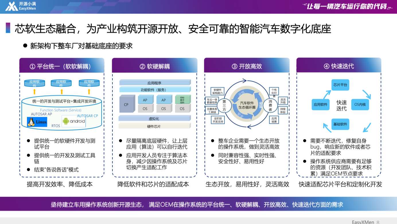 普華基礎(chǔ)軟件通過開源戰(zhàn)略為這一挑戰(zhàn)提供了解決方案。張曉先介紹,普華于2023年2月發(fā)布了開源微內(nèi)核項(xiàng)目EasyADA,并于同年10月24日(程序員節(jié))上線了開源安全車控操作系統(tǒng)“小滿”(EasyXMen),后者以中國農(nóng)歷節(jié)氣“小滿”命名,寓意生機(jī)勃勃的生態(tài)發(fā)展。小滿項(xiàng)目包含約40萬行代碼,688個文件,托管于開源基金會,涵蓋協(xié)議站、工具鏈和基于多種芯片的可運(yùn)行示例工程。工具鏈可免費(fèi)申請使用,降低了開發(fā)者的使用門檻。