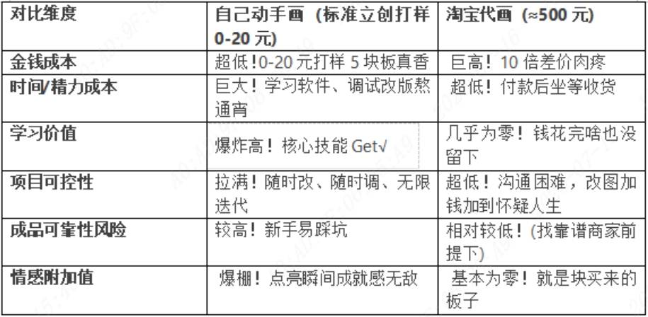自己畫(huà):省錢(qián)但可能“翻車(chē)”,0元學(xué)費(fèi)買(mǎi)教訓(xùn);淘寶代畫(huà):省心但肉疼,500元換來(lái)的是“任人宰割”的無(wú)力感。