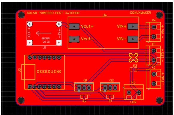 該設(shè)備使用專門的365nm光譜紫外LED來吸引飛蟲,并使用風(fēng)扇將它們捕獲在陷阱中,所有這些都完全由太陽能供電。它具有內(nèi)置的光傳感器(LDR),可以在夜間自動激活系統(tǒng),遵循智能循環(huán)。一開始,紫外線燈打開,無聲地引誘蟲子60秒,然后短暫激活風(fēng)扇30秒,捕捉它們。這個循環(huán)在整個晚上重復(fù),并在日出時停止,電池由太陽能電池板充電,使系統(tǒng)高度可持續(xù)和低維護。該項目采用全3d打印設(shè)計。用戶可以在底部的托盤中放置油來捕獲捕獲的昆蟲,然后可以很容易地在使用后取出和清洗。