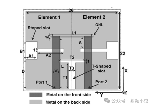 除了上述方法外,缺陷地結(jié)構(gòu)也是一種有效的解耦策略。它主要包括兩種類型:一種是在接地面上刻蝕解耦頻段對應(yīng)的縫隙槽,使表面電流耦合在縫隙上,從而減少天線單元之間的相互耦合;另一種則是通過刻蝕多條縫隙來延長電流耦合路徑,達(dá)到解耦的效果。這種方法簡單易行,且效果顯著。