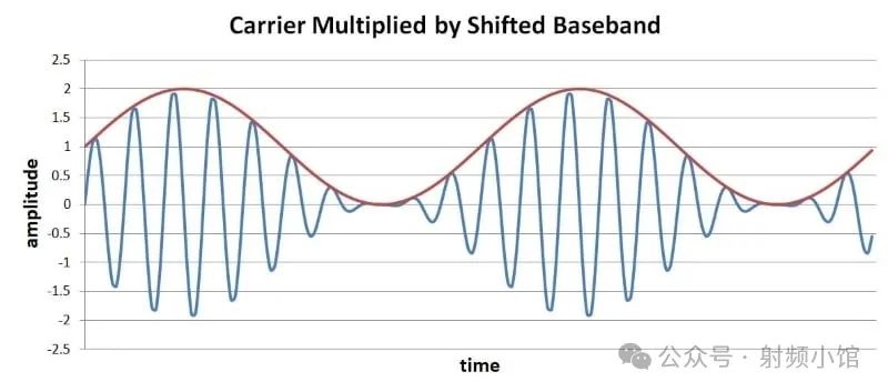你可以清楚地看到基帶信號(hào)(紅色)與載波振幅(藍(lán)色)之間的關(guān)系。