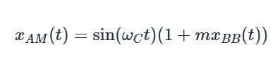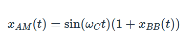 xAM 是幅度調(diào)制的波形,它由載波 xC 和基帶信號 xBB 構(gòu)成。如果我們認為載波是一個無限長、恒定幅度、固定頻率的正弦波,并且假設其幅度為1,那么我們可以將 xC 替換為 sin(ωCt)。