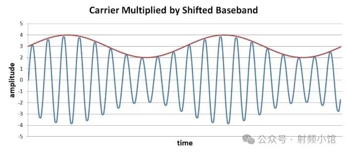 現(xiàn)在,載波的幅度對基帶信號的變化值“更加敏感”。由于我根據(jù)調(diào)制指數(shù)選擇了直流偏置,所以偏移后的基帶信號不會進入y軸的負部分。
