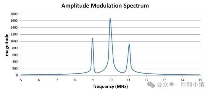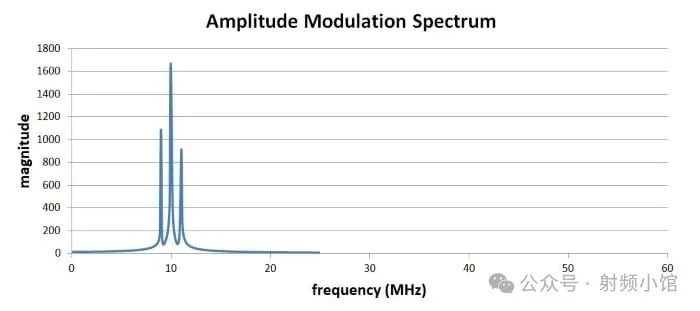 如果我們更仔細地觀察調(diào)制后的頻譜,可以看到兩個新的峰值分別位于載波頻率上方和下方各1 MHz(即基帶頻率):