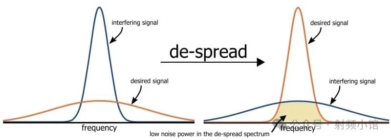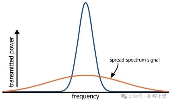 擴頻信號具有較低的峰值功率、相等的總功率和更寬的帶寬。換句話說,可用的傳輸功率被分布在更寬的頻率范圍內。