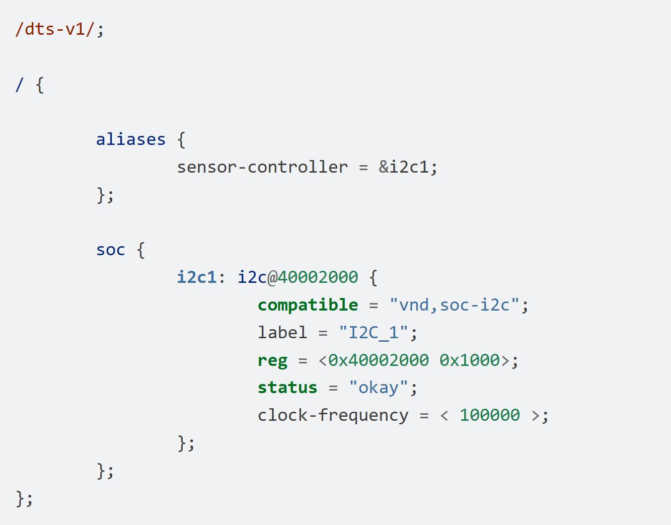 DT_INST(x, vnd_soc_i2c):尋找第x個(gè)兼容名為“vnd,soc-i2c”的節(jié)點(diǎn)。在本例中因?yàn)橹挥幸粋€(gè)節(jié)點(diǎn),x應(yīng)為0。在多“vnd, soc-i2c”節(jié)點(diǎn)的情況下,x和設(shè)備樹中節(jié)點(diǎn)的對應(yīng)關(guān)系不能保證。