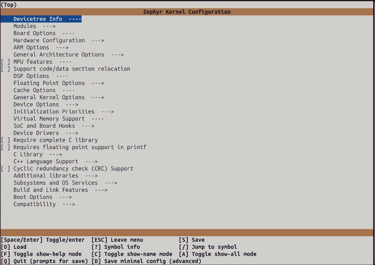 與Linux類似,在Zephyr中可以通過命令行界面進(jìn)行Kconfig選項(xiàng)配置[13]。針對應(yīng)用構(gòu)建后產(chǎn)生的build文件夾運(yùn)行命令“west build --build-dir ./build -t menuconfig”即可進(jìn)入命令行界面(見圖10)。