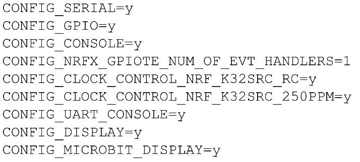 開發(fā)板和應(yīng)用可以指定需要啟用的配置。BBC micro:bit V2板的默認(rèn)選項(xiàng)位于文件boards/bbc/microbit_v2/bbc_microbit_v2_defconfig中,包括系統(tǒng)時(shí)鐘、串口和控制臺等選項(xiàng)。每個(gè)應(yīng)用中的prj.conf則包含了應(yīng)用所需的選項(xiàng)。