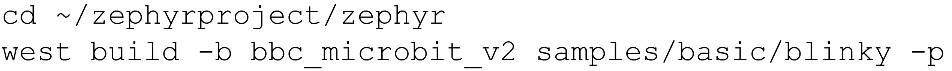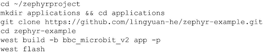 Zephyr的樣例庫中包括眾多開發(fā)板和傳感器的樣例,不過指南中提到的閃燈樣例(Blinky,路徑samples/basic/blinky)并不能直接套用在micro:bit V2上。此處我們采用micro:bit V2的LED矩陣顯示樣例(路徑samples/boards/bbc/microbit/display)。連接開發(fā)板到Ubuntu系統(tǒng)上,運(yùn)行圖13中的命令進(jìn)行編譯和燒錄。命令中的“-p”選項(xiàng)意味著進(jìn)行全新編譯,當(dāng)對工程進(jìn)行重復(fù)編譯時(shí)使用“-p auto”選項(xiàng)允許west工具只對更改的部分進(jìn)行重新編譯,這適合在開發(fā)迭代時(shí)節(jié)約時(shí)間。