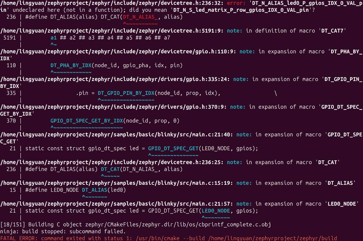 第2.2.4節(jié)中提到,Zephyr提供一整套設(shè)備樹宏,本例中GPIO代碼使用的DT_ALIAS宏不能完全展開。Zephyr中設(shè)備樹宏錯(cuò)誤的原因一般都與編譯錯(cuò)誤中提到的頭文件無關(guān),而是設(shè)備樹有格式/內(nèi)容的錯(cuò)誤,或者訪問設(shè)備樹的方式有誤。幾種常見的錯(cuò)誤如下: