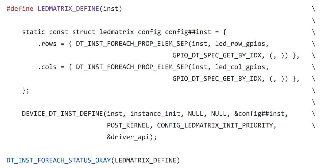 和上一節(jié)提到的傳感器驅(qū)動類似,DT_INST_FOREACH_STATUS_OKAY針對每個(gè)狀態(tài)為就緒的、兼容名為“custom-ledmatrix”的設(shè)備進(jìn)行驅(qū)動初始化。