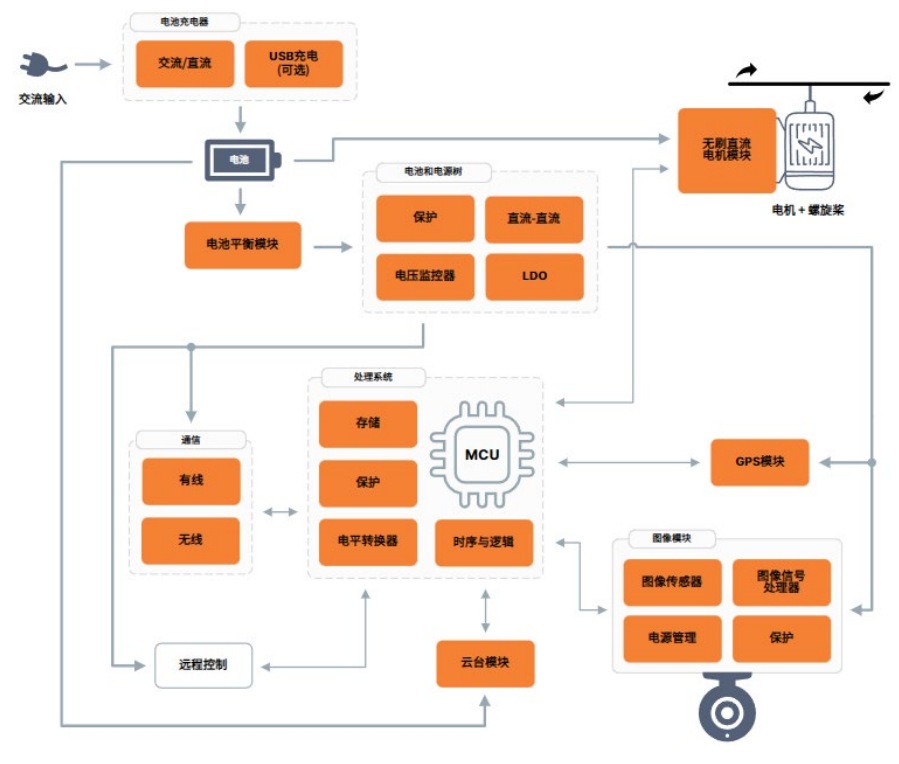 下面的框圖展示了安森美(onsemi)推薦的無人機方案。