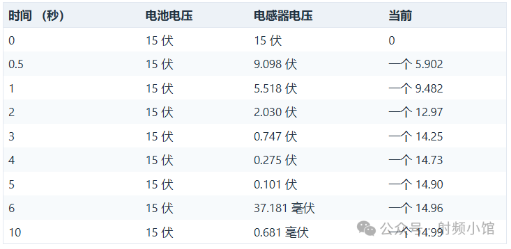 當開關剛閉合時,電流為零,然后隨時間逐漸增加,直到等于電池電壓除以1Ω串聯(lián)電阻。這種行為與串聯(lián)電阻 - 電容電路的行為正好相反,在串聯(lián)電阻 - 電容電路中,電流從最大值開始,而電容電壓為零。我們來看看用實際數(shù)值是如何體現(xiàn)的: