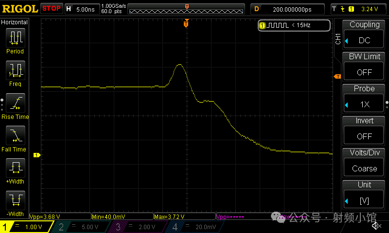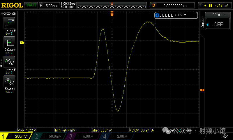 結(jié)果:輸出端觀測(cè)到持續(xù)約900ns 的正脈沖,其最大幅值約為±4V。只要幅值低于儀器的最大交流額定值,此現(xiàn)象不會(huì)造成問題。