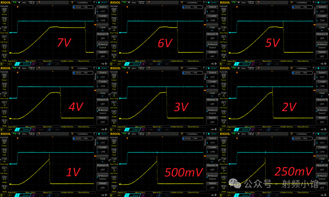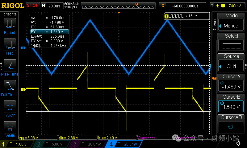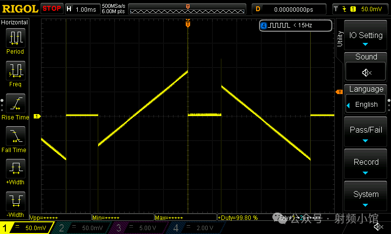 為了展示其效果,我們輸入一個(gè)低電平接近設(shè)定限幅電壓的方波,并注意到隨著頻率的升高,輸出占空比發(fā)生變化。