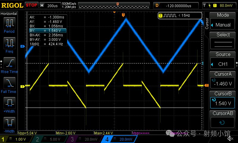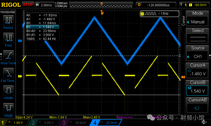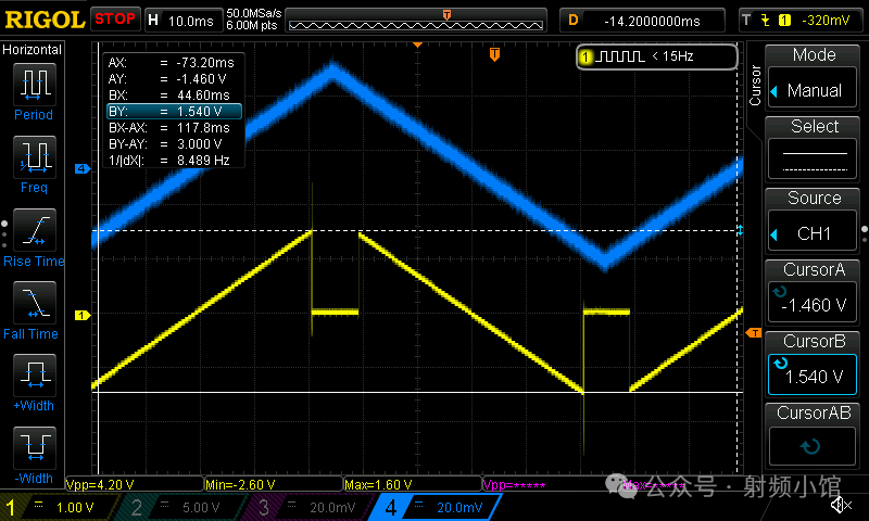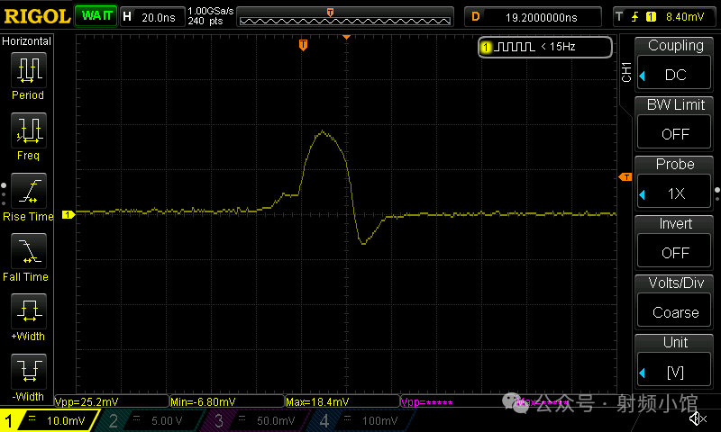 使用信號(hào)發(fā)生器產(chǎn)生一個(gè)80mV峰峰值的三角波形,輸出端串聯(lián)一個(gè)26dB衰減器: