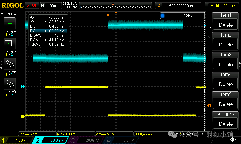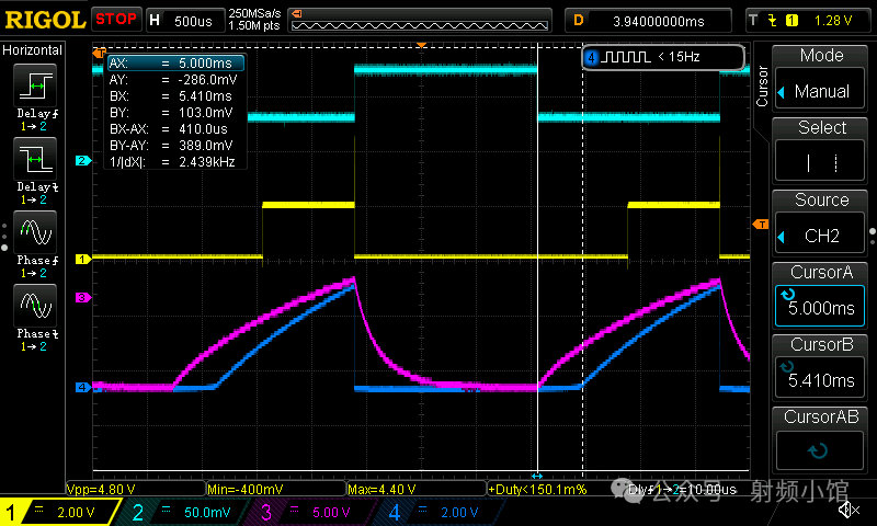 在上述示波器截圖中,可以觀察到 RC 電路對(duì)限幅時(shí)間的影響,確實(shí)延長(zhǎng)了削波持續(xù)時(shí)間。