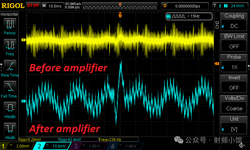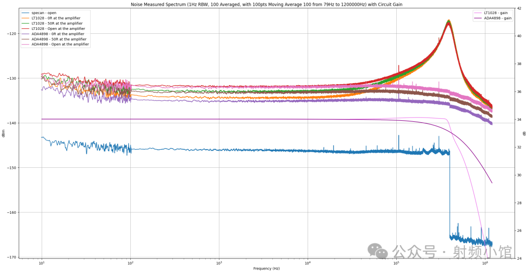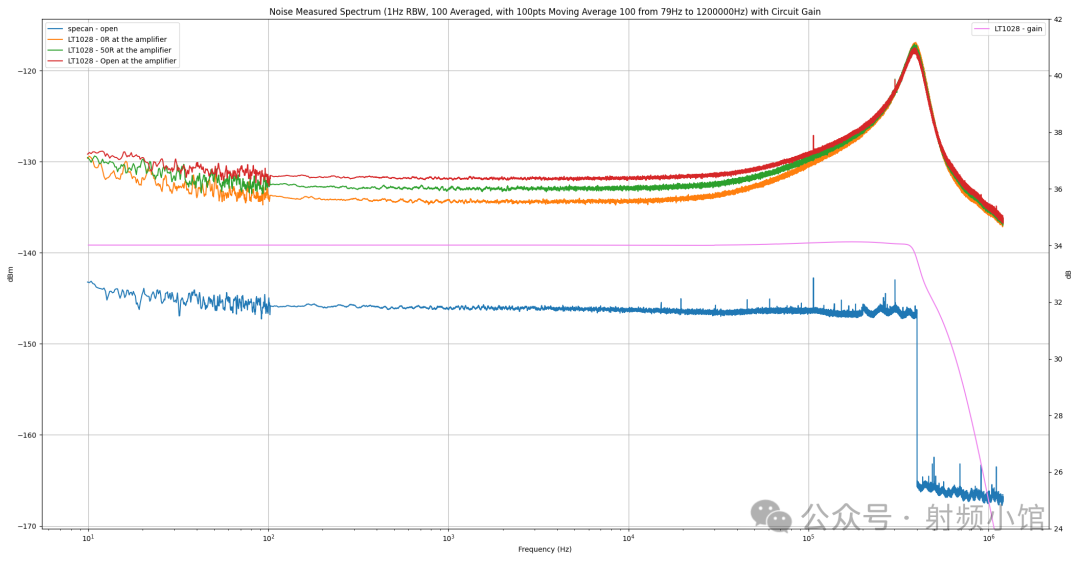 通過計(jì)算可知,LT1028的1nV/sq(Hz)輸入噪聲經(jīng)50.5倍增益后,等效輸出噪聲為50.5nV/sq(Hz)(即-133dBm),高于SA44B的-139.3dBm本底噪聲。需要說明的是,此處我忽略了LT1028輸出端電壓緩沖級(jí)產(chǎn)生的噪聲貢獻(xiàn)(其相對(duì)較低)。