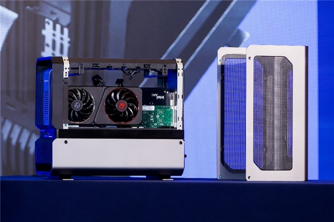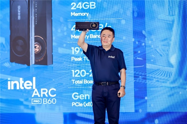 英特爾中國區(qū)技術(shù)部總經(jīng)理高宇展示“一卡雙芯”的英特爾銳炫ProB60顯卡