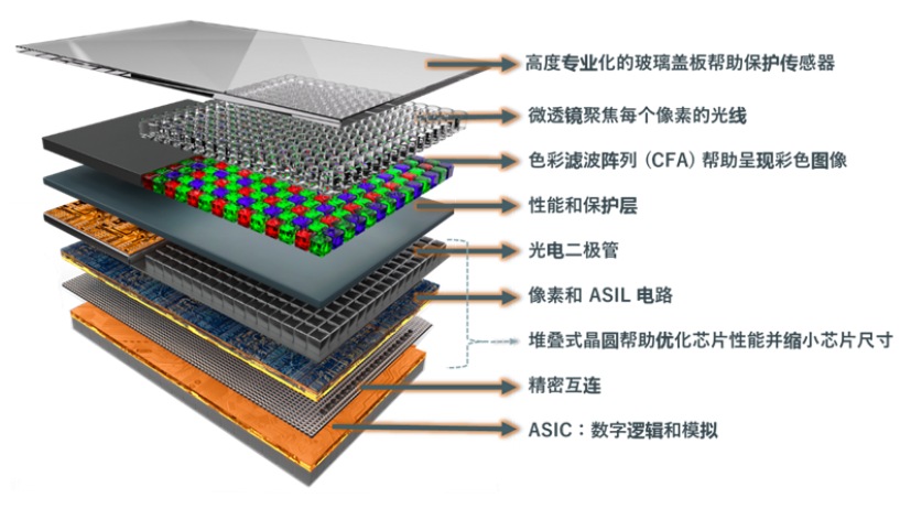 因此,這些器件的尺寸會隨著數(shù)字功能的增加而增大,同時像素陣列和數(shù)字邏輯的工藝技術(shù)相同,導(dǎo)致效率低下。背照式晶片堆疊技術(shù)是將晶片層層堆疊并鍵合在一起,解決了這一問題。頂部晶片包含像素和周邊電路。底部晶片包含電路和其他支持功能,從而實現(xiàn)了尺寸和技術(shù)的優(yōu)化。