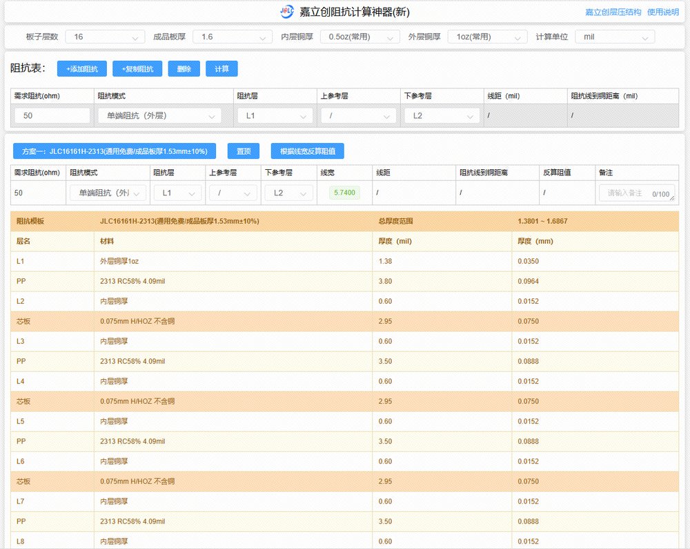 計算線寬和層厚:利用阻抗計算工具,根據(jù)目標阻抗和層疊結(jié)構(gòu)參數(shù),計算信號線的線寬和層厚。信號的阻抗可利用Polar Instruments公司開發(fā)的Polar SI6000或者嘉立創(chuàng)的阻抗計算神器等工具計算。