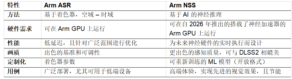 Arm NSS 是基于 Arm 精銳超級分辨率技術(shù) (Arm Accuracy Super Resolution, Arm ASR) 的成果而構(gòu)建,Arm ASR 是一款面向移動設(shè)備,實現(xiàn)時域優(yōu)化升級的開源解決方案。而 Arm NSS 是針對搭載神經(jīng)加速器的移動設(shè)備,旨在為開發(fā)者提供先進(jìn)的神經(jīng)優(yōu)化升級解決方案,因此,對于不具備此類能力的移動設(shè)備,Arm ASR 仍然是經(jīng)高度優(yōu)化的可選方案。