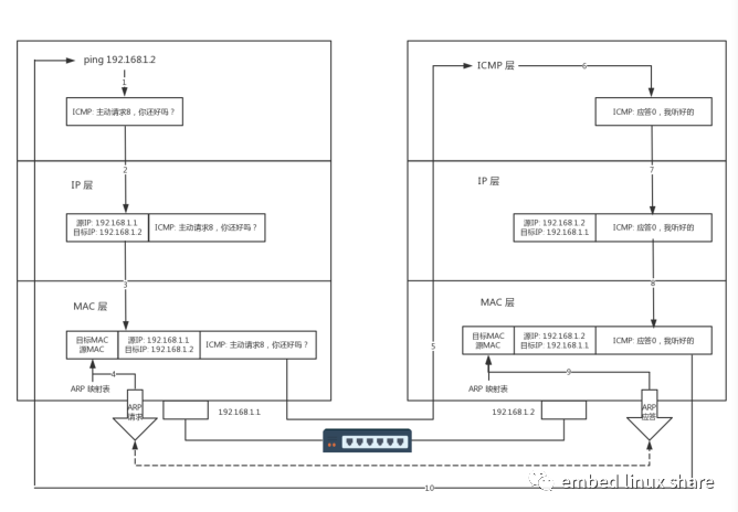 主機(jī) B 收到這個(gè)數(shù)據(jù)幀后,先檢查它的目的 MAC 地址,并和本機(jī)的 MAC 地址對比,如符合,則接收,否則就丟棄。接收后檢查該數(shù)據(jù)幀,將 IP 數(shù)據(jù)包從幀中提取出來,交給本機(jī)的 IP 層。同樣,IP 層檢查后,將有用的信息提取后交給 ICMP 協(xié)議。主機(jī) B 會構(gòu)建一個(gè) ICMP 應(yīng)答包,應(yīng)答數(shù)據(jù)包的類型字段為 0,順序號為接收到的請求數(shù)據(jù)包中的順序號,然后再發(fā)送出去給主機(jī) A。