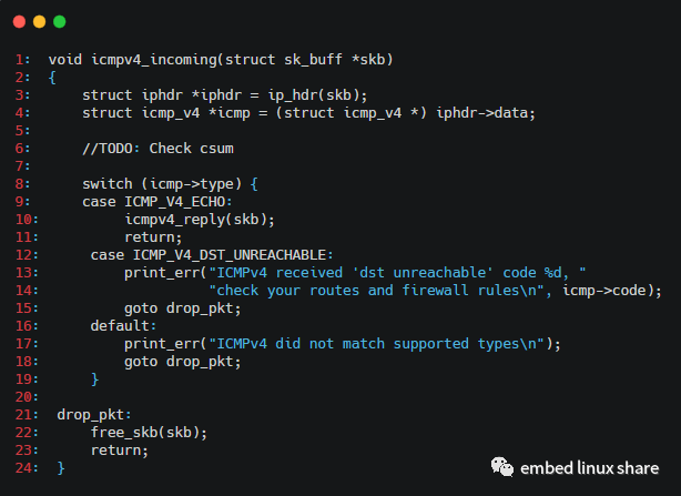 第8行:判斷icmp的報(bào)文類型,如果是查詢報(bào)文,則調(diào)用icmpv4_reply()函數(shù)